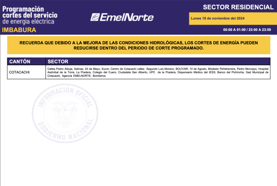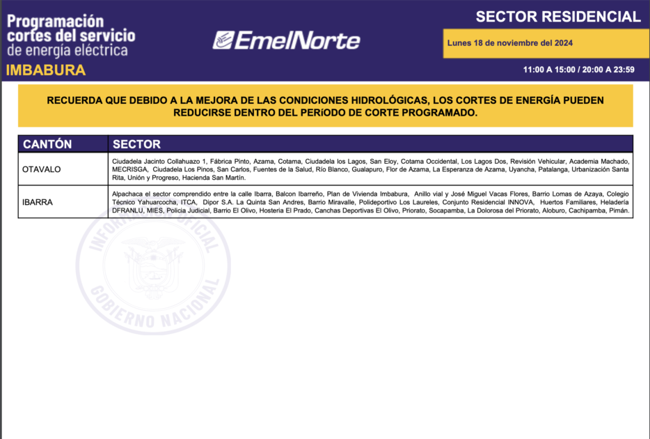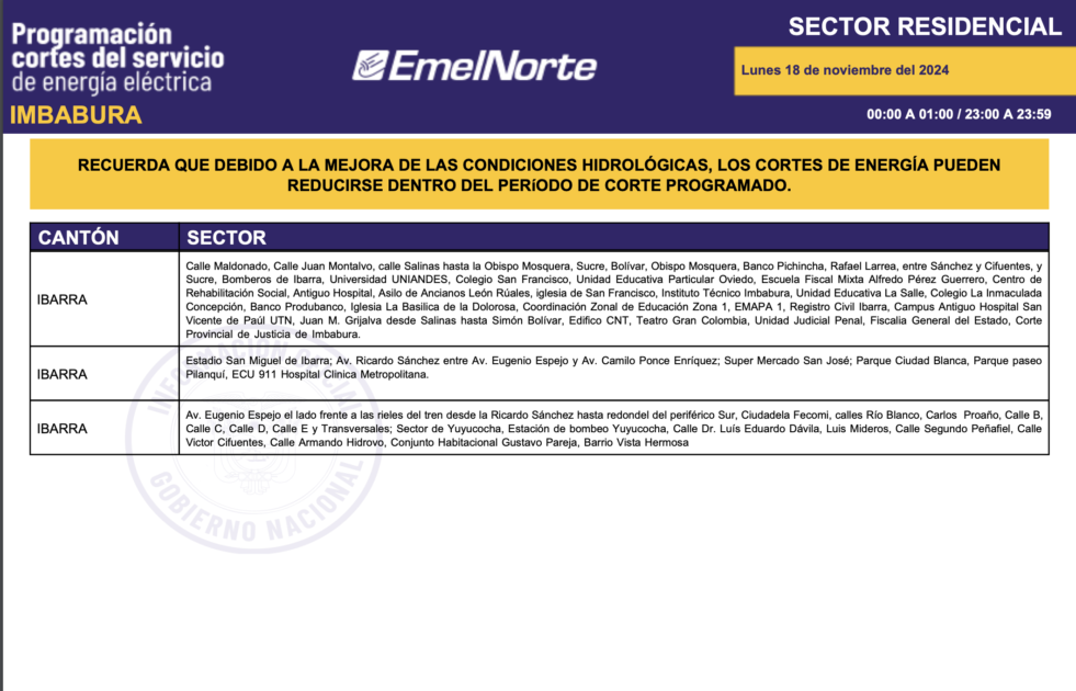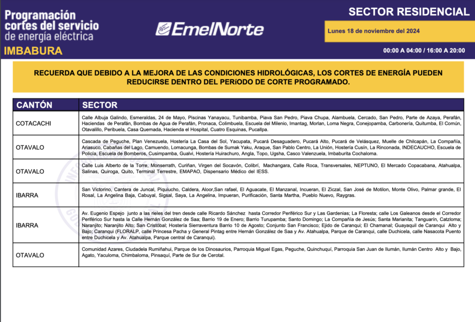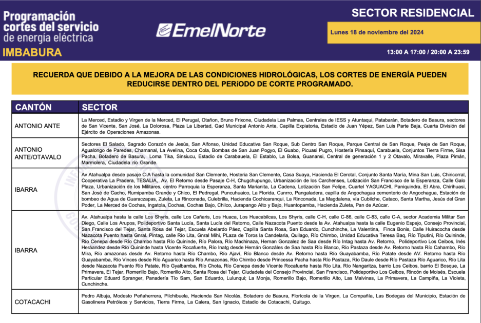 La Ministra Inés Manzano informó, la noche de este domingo, 17 de noviembre de 2024, sobre el inició de la compra de energía a Colombia. La primera entrega fue de 420 megavatios y para este lunes se espera 440. Con esto, más el mejoramiento de las condiciones hídricas en la zona de operación de la central Coca Codo Sinclair, que este fin de semana aportó con más de 600 megavatios, desde este lunes 18 de noviembre los cortes de energía se reducirán a ocho horas sobre todo en la provincia de Imbabura. Los horarios de cortes son los siguientes.