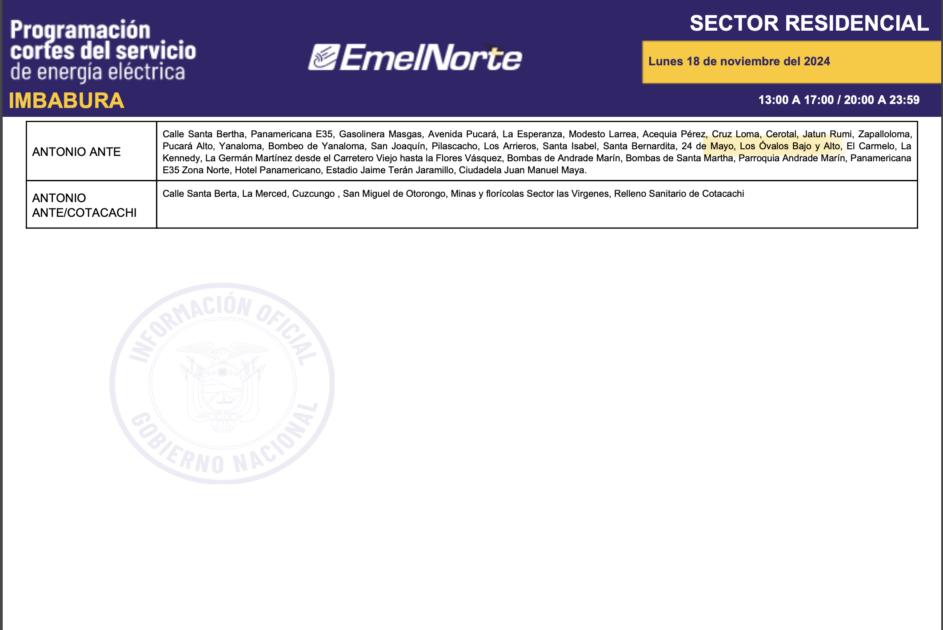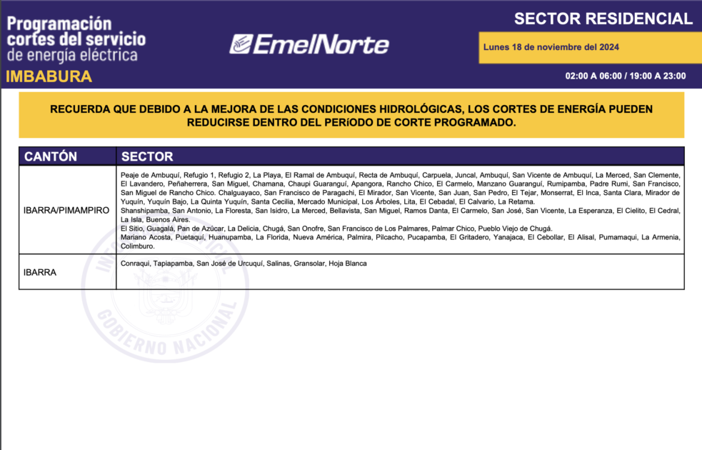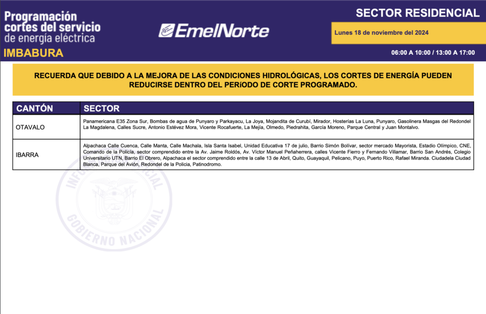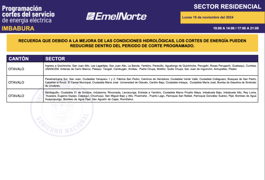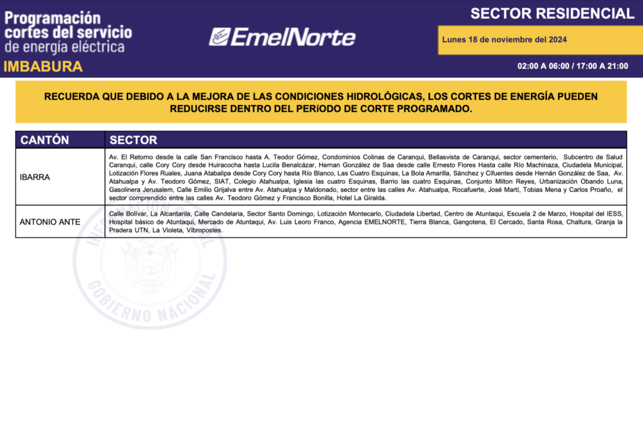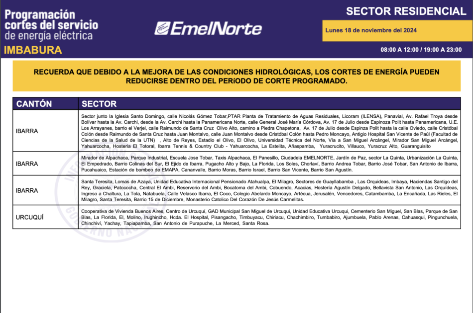 La Ministra Inés Manzano informó, la noche de este domingo, 17 de noviembre de 2024, sobre el inició de la compra de energía a Colombia. La primera entrega fue de 420 megavatios y para este lunes se espera 440. Con esto, más el mejoramiento de las condiciones hídricas en la zona de operación de la central Coca Codo Sinclair, que este fin de semana aportó con más de 600 megavatios, desde este lunes 18 de noviembre los cortes de energía se reducirán a ocho horas sobre todo en la provincia de Imbabura. Los horarios de cortes son los siguientes.