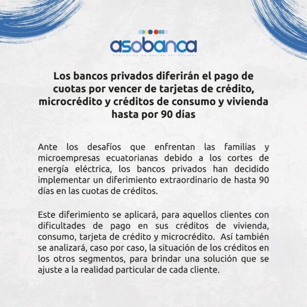 La Asociación de Bancos Privados del Ecuador (Asobanca) anunció la implementación de un diferencial extraordinario de hasta 90 días en las cuotas para vencer de créditos de vivienda, consumo, tarjetas de crédito y microcrédito. Esta medida busca aliviar la situación de familias y microempresas ecuatorianas, que se han visto afectadas por los cortes de energía eléctrica que afectan al país desde mediados de septiembre.