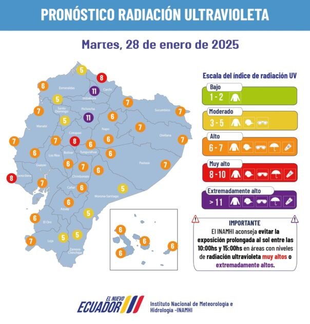 El Instituto Nacional de Meteorología e Hidrología (Inamhi) alertó sobre niveles altos de radiación solar en 26 puntos de Ecuador este martes 28 de enero de 2025, incluyendo niveles “extremadamente altos” en las provincias de Pichincha e Imbabura.