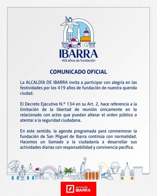 La Alcaldía de Ibarra confirmó este martes, mediante un comunicado oficial, que la agenda programada para conmemorar los 419 años de fundación de San Miguel de Ibarra se desarrollará con total normalidad, a pesar de la vigencia del estado de excepción decretado por el Gobierno Nacional.