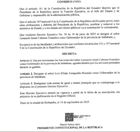Mediante Decreto Ejecutivo emitido este jueves, el presidente de la República, Daniel Noboa Azín, oficializó el relevo en la Gobernación de Imbabura. Con esta decisión, se dieron por terminadas las funciones de Leonardo Israel Cabezas González y se designó a Luis Efraín Amaguaña Muenala como el nuevo representante del Ejecutivo en la provincia.