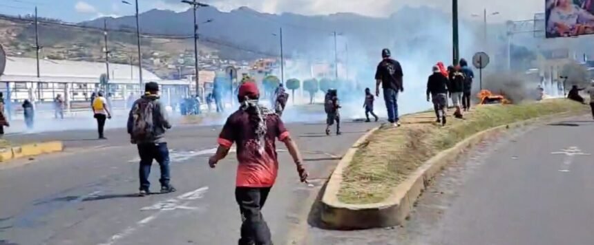 Comuneros protagonizan intensos enfrentamientos con miembros de la Policía Nacional y Fuerzas Armadas en los exteriores del Comando de Policía de Otavalo. Las protestas se intensificaron la tarde de este lunes, con exigencias por la liberación de varios comuneros detenidos horas antes por efectivos policiales.