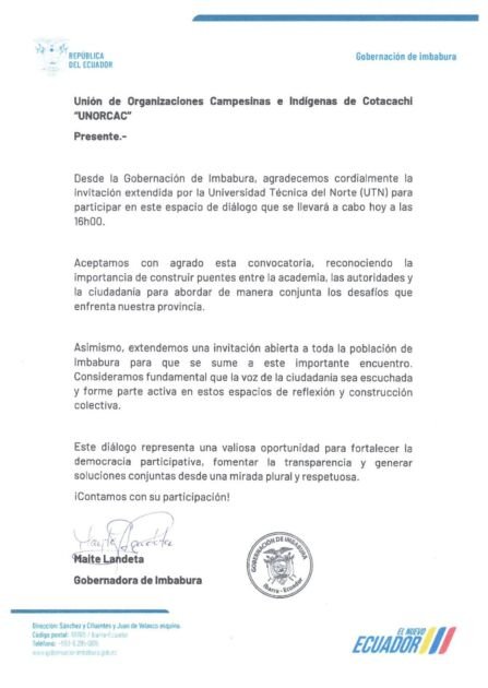 La Gobernación de Imbabura anunció su participación en el espacio de diálogo convocado por la Universidad Técnica del Norte (UTN), programado para hoy a las 16:00. La confirmación se realizó a través de un oficio remitido a la Unión de Organizaciones Campesinas e Indígenas de Cotacachi (UNORCAC).