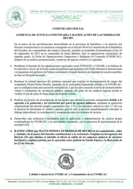 La Unión de Organizaciones Campesinas e Indígenas de Cotacachi (UNORCAC) emitió un comunicado en el que responde a la invitación pública de la gobernadora de Imbabura, Maite Landeta, para participar en un diálogo previsto en la Universidad Técnica del Norte (UTN).