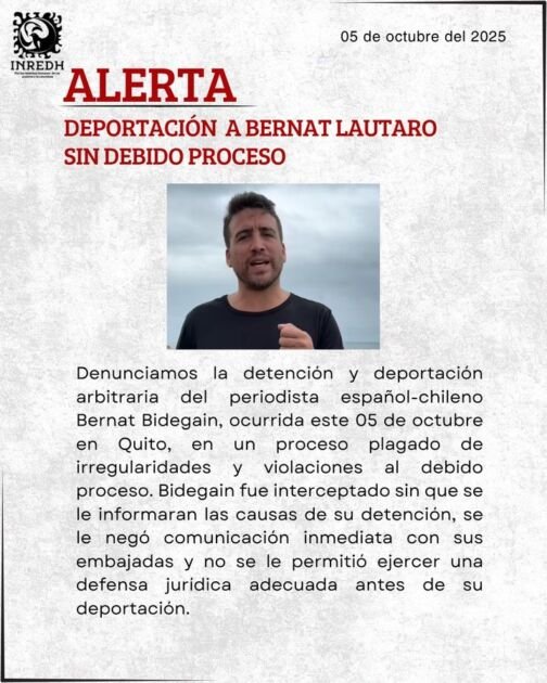 La madrugada de este lunes fue deportado el periodista español Bernat Lautaro, quien se encontraba en Ecuador cubriendo las movilizaciones del #ParoNacional2025, especialmente en la provincia de Imbabura. La decisión ha generado una fuerte reacción por parte de organizaciones defensoras de derechos humanos y de la libertad de prensa.