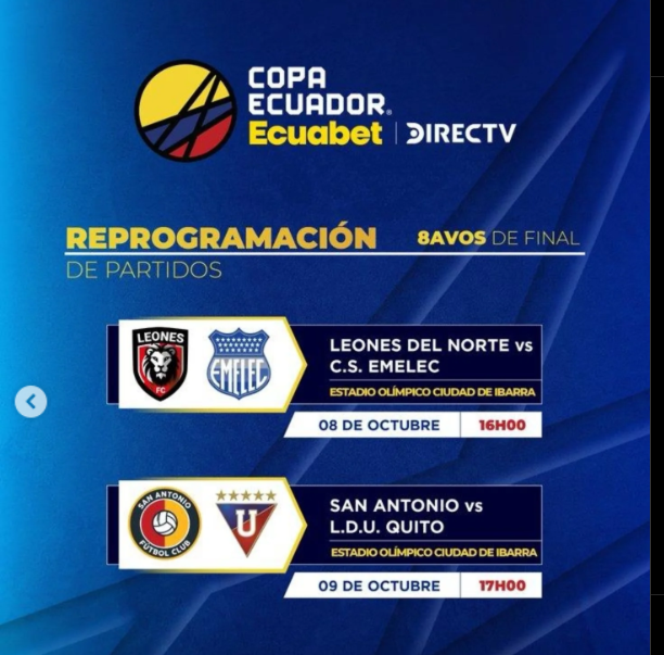 La paralización que afecta a la provincia de Imbabura desde hace 15 días podría obligar a reprogramar dos partidos clave de los octavos de final de la Copa Ecuador. Los encuentros entre Leones Fútbol Club vs. Emelec y San Antonio vs. Liga Deportiva Universitaria de Quito, programados para este miércoles 8 y jueves 9 de octubre, respectivamente, están en duda debido a los bloqueos viales y restricciones de movilidad en la zona.