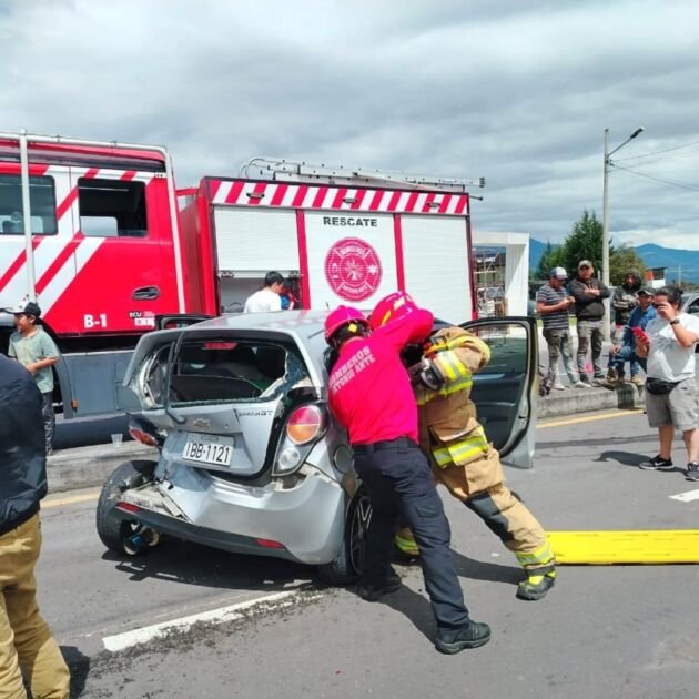 Una mujer de 33 años fue liberada por el Cuerpo de Bomberos de Antonio Ante luego de quedar atrapada en un vehículo accidentado en la Panamericana E-35, a la altura del barrio Sagrado Corazón de Jesús, sector San Roque.