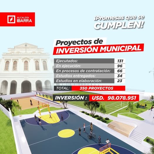 La Alcaldía de Ibarra presentó un balance positivo de su gestión de inversión municipal, destacando la ejecución y desarrollo de 350 proyectos que abarcan infraestructura, movilidad, espacios públicos, servicios básicos, deporte, cultura y desarrollo urbano, con una inversión total de USD 98.078.951.