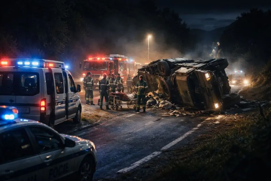 La noche de este sábado 15 de febrero de 2026 se registró un accidente de tránsito en el sector Cuambo, cantón Ibarra, provincia de Imbabura, donde un camión de uso militar se volcó, dejando aproximadamente diez personas heridas, según el reporte preliminar.
