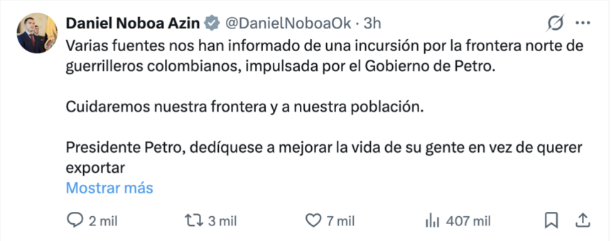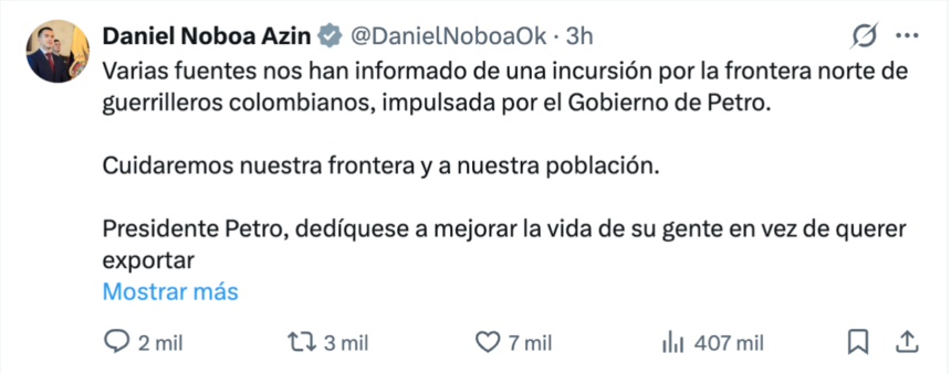 El mandatario ecuatoriano afirmó que “varias fuentes” le informaron sobre una presunta incursión de “guerrilleros colombianos” en la frontera norte de Ecuador, la cual, según dijo, estaría “impulsada por el Gobierno de Petro”. En su mensaje, Noboa aseguró que su administración reforzará la seguridad fronteriza para proteger a la población y exhortó al presidente colombiano a centrarse en la situación interna de su país.